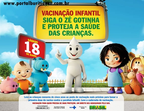A campanha de mídia para esta primeira fase começou em nosso município desde o dia 13 de junho, sendo distribuída nas Unidades de Saúde, mas o dia “D” para esta primeira etapa, faz-se neste SÁBADO 18 DE JUNHO, onde todas as crianças de 0 a 05 anos de idade devem ser levadas para receberem as 02 gotinhas da Poliomielite, na Unidade de Saúde Mão Santa (Bairro Macambira), Unidade de Saúde Dr. Joaquim Narciso (Conjunto Cohab), Hospital Dr. Mariano Lucas (BR 343), CEO (Praça Antonio Romão), e na Capela de São José (outro lado da passagem) em nossa Cidade.