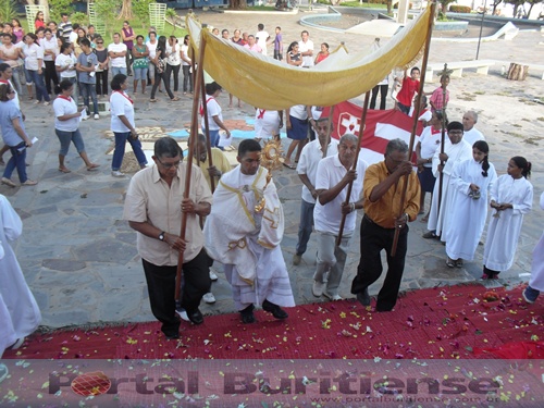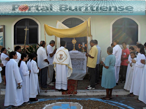 Embora alguns comércios funcionando com suas portas abertas por onde passava a procissão, o feriado nacional de CORPUS CHRISTI, parecia desapercebido para a população, esta mesma população onde segundo senso do Instituto Brasileiro de Geografia e Estatística (IBGE), confirma que 80% se diz Católico Apostólico Romano, ou seja; que somos CRENTES na Hóstia Consagrada, pois segundo esta mesma Igreja, Crer na presença real de Jesus na Eucaristia é uma Graça extraordinária, uma verdade desafiadora, pois foi o próprio Jesus que anunciou aos discípulos em Cafarnaum que ele era o Pão vivo descido dos céus, que sua carne era verdadeira comida e seu sangue verdadeira bebida.