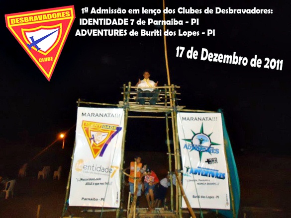 No ultimo sábado, dia 17 de Dezembro de 2011, na Avenida 3 de maio em Parnaíba – PI. Aconteceu a 1ª Admissão em Lenço (Formatura) dos Clubes de Desbravadores Adventures de Buriti dos Lopes e Clube Identidade 7 de Parnaíba.