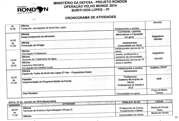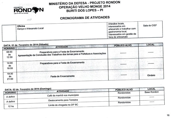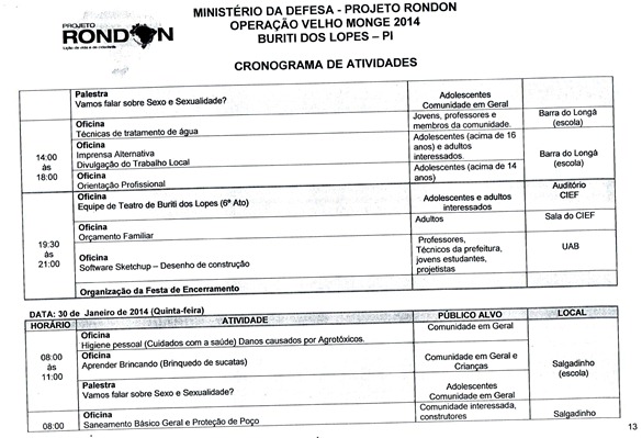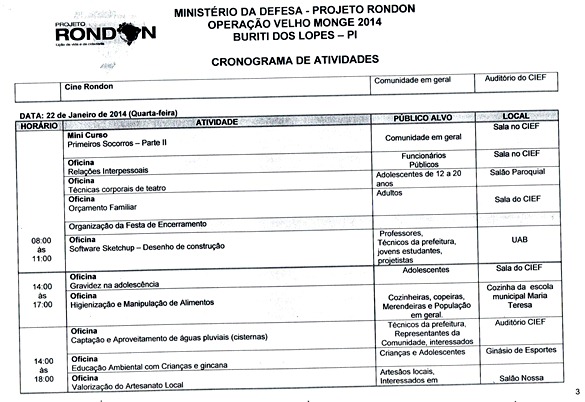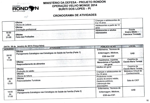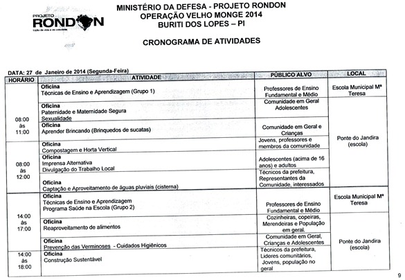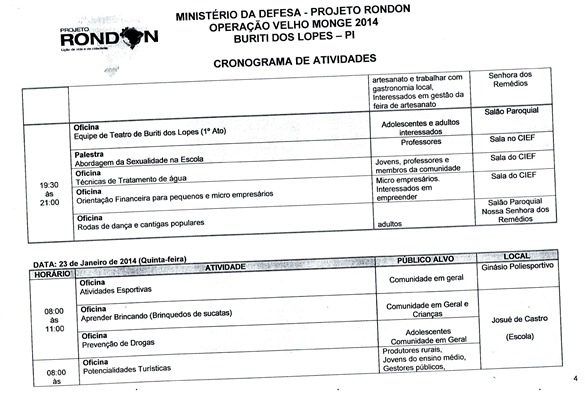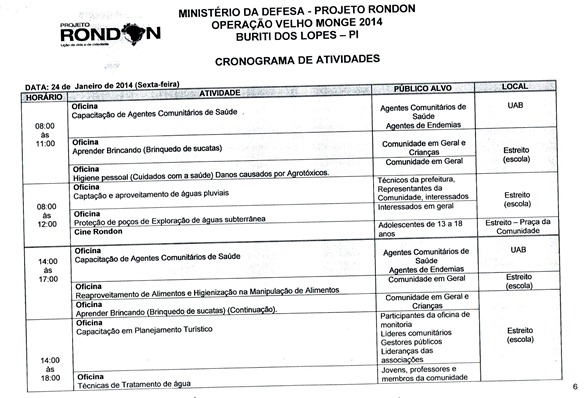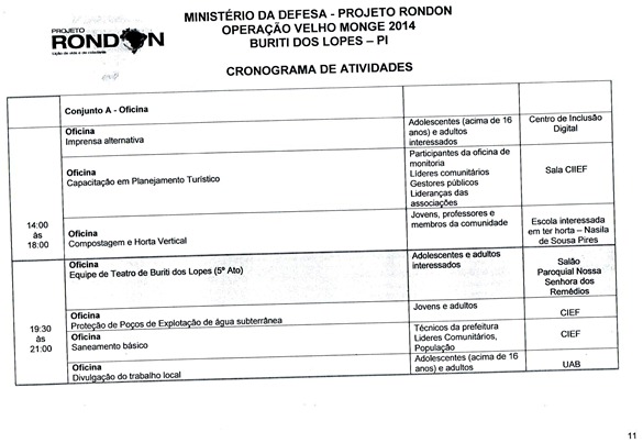 Divulgado o cronograma de atividades que serão realizadas pela equipe do Projeto Rondon em Buriti dos Lopes, nesse cronograma foi definido a data, horário e local de todas as atividades. As inscrições para participação em um dos cursos, palestras ou oficinas estão sendo realizadas na Secretaria Municipal de Educação das 08:00 às 13:30, vale lembrar aos interessados que também é possível realizar a inscrição nas localidades da zona rural que receberão uma das atividades. Informamos ainda aos universitários do Polo UAB de nossa cidade que nesta sexta (17) e sábado (18) será possível realizar a inscrição na sede do polo.
