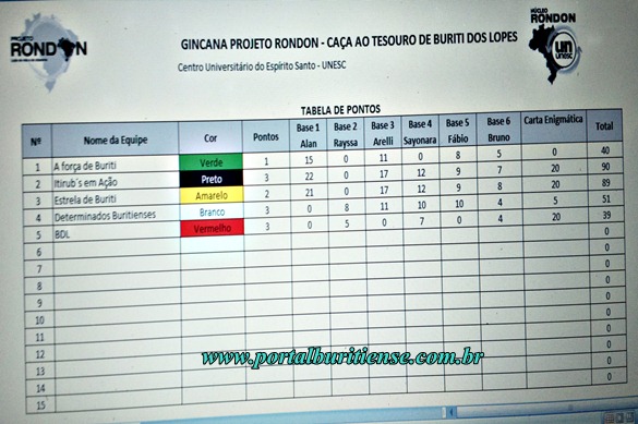 Uma gincana que não importava a idade, todos puderam participar e competir de igual pra igual, as equipes tinham que pegar em cada base as peças para a montagem de mapa do tesouro, do mais valioso tesouro que existia em Buriti dos Lopes, ao final da competição foi revelado o grande enigma e finalmente descoberto qual seria esse tesouro, o nosso maior bem seria o CONHECIMENTO. Um momento que certamente ficará guardado na memória e lembrança de todos que participaram do evento.