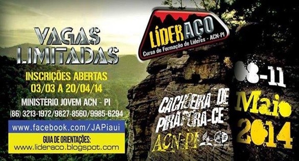 Dia 20 deste mês termina o prazo de inscrição para o LíderAÇO, que acontecerá no próximo mês. O LIDERAÇO é um programa de formação de Líderes de Desbravadores que objetiva de forma inovadora e diferenciada, capacitar nossa juventude a crescer com formação prática e aperfeiçoada nos aspectos: físico, mental e espiritual. Associação Costa Norte – Piauí.