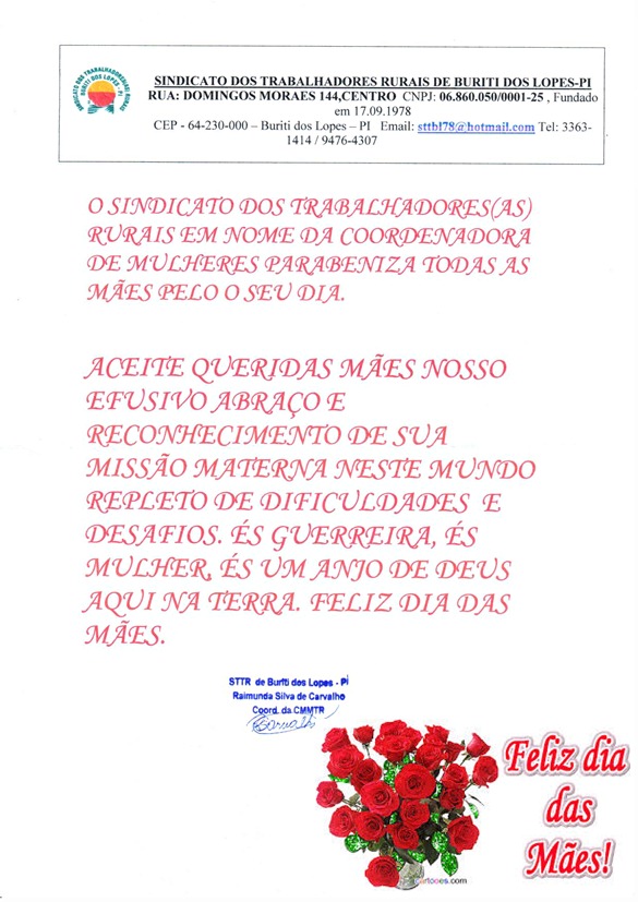 Sindicato dos Trabalhadores Rurais Felicita as Mães Buritienses