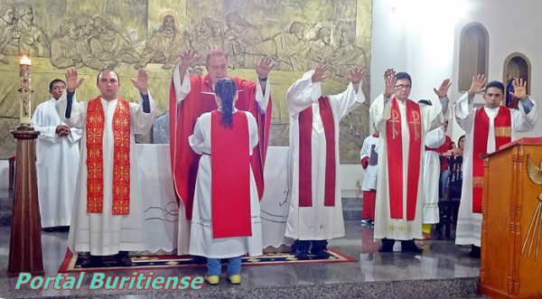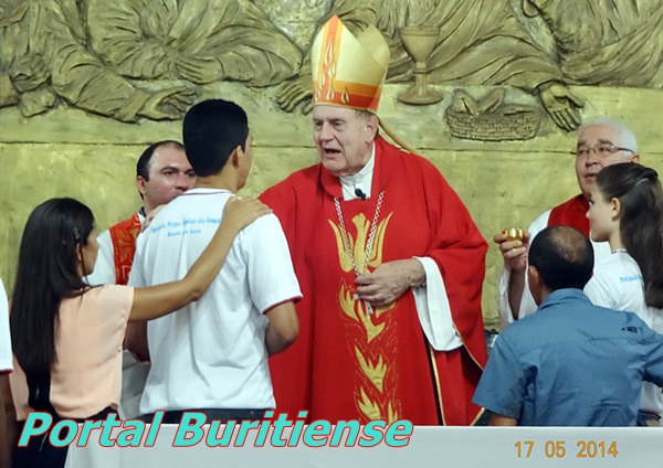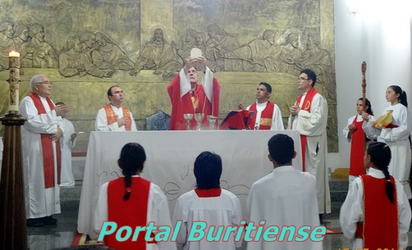 No último sábado, 17 /05, o nosso Bispo Dom Alfredo, presidiu a celebração eucarística em que foi conferido o sacramento da confirmação a 168 pessoas, Em sua homilia, Dom Alfredo fez questão de lembrar aos crismandos que o sacramento da Crisma era uma nova etapa, uma parte de algo maior a ser vivido na caminhada cristã e que seus padrinhos(as) tem um papel importantíssimo em suas vidas assim como o afilhado(a) na vida do Padrinho(a) caminhando juntos irão mais longe. Concelebraram com o bispo, Pe. Oscar, Pe. João de Jesus, Pe. Marlos e Pe. Marcelino. Ao final da missa, o Bispo Chamou todos os catequistas ao altar e pediu a comunidade para agradecê-los pelo belíssimo trabalho para Deus. O nosso pároco, Pe.Oscar agradeceu a todos que colaboraram e colaboram com a catequese em nossa paróquia.