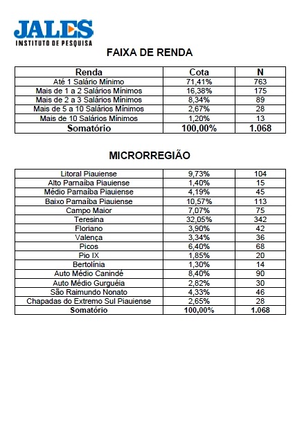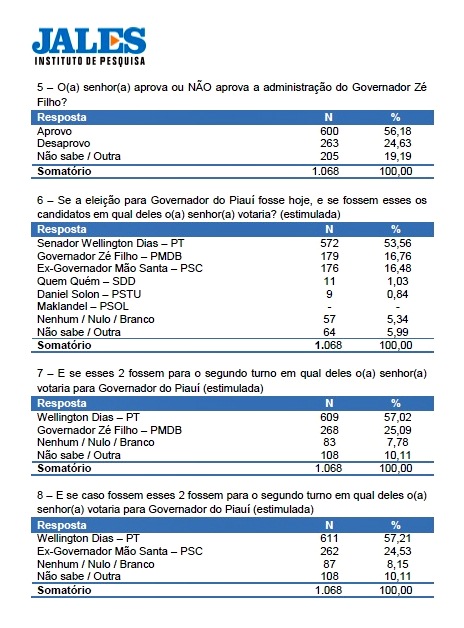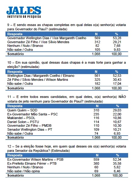 Instituto Jales divulga pesquisa de intenção de votos para a corrida eleitoral que se aproxima, a pesquisa foi aplicada em 53 municípios piauienses entre os dias 20 a 24 de junho, segundo os resultados da pesquisa o cenário político nacional e estadual seriam definidos ainda em primeiro turno. A pesquisa indica que os candidatos do Partido dos Trabalhadores – PT, Dilma e Wellington venceriam ainda no primeiro turno, Dilma aparece com 60,11% das intenções de voto e Wellington Dias com 53,56.