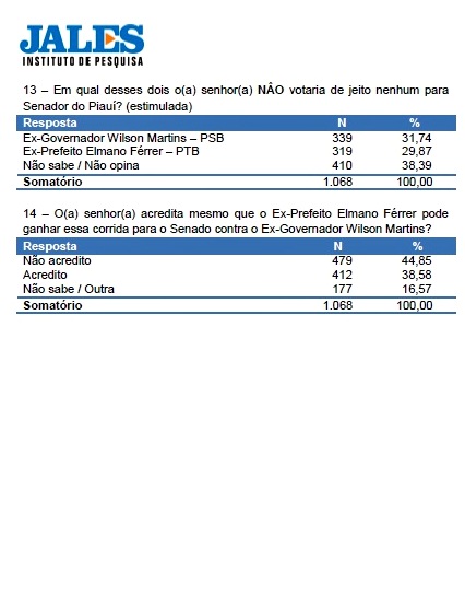 O resultado também mostra a situação na corrida pelo Senado Federal, para os entrevistados se a eleição fosse hoje Wilson Martins do PSB receberia 52,34% das intenções de voto contra os 35,58% que seria dados a Elmano Férrer do PTB. A pesquisa de uma margem de erro de 3% para mais ou menos e foi aplicada para 1.068 eleitores.