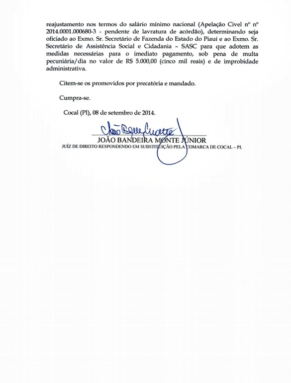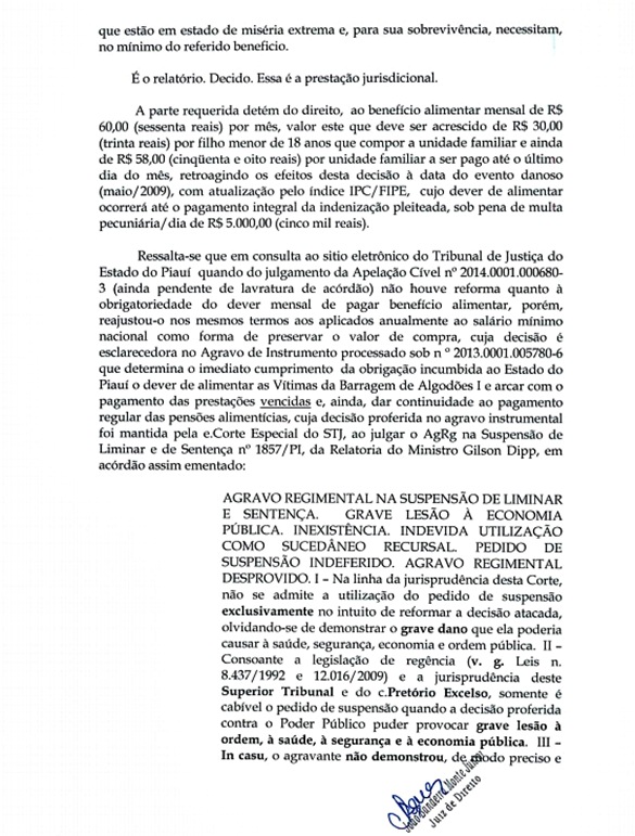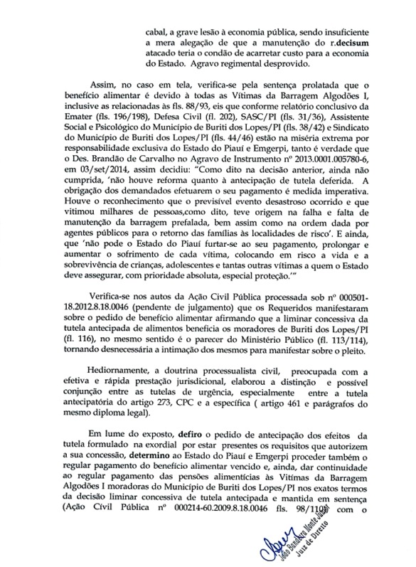JUSTA DECISÃO.  O Juiz Dr. João Bandeira Monte Júnior da Comarca de Cocal/PI concedeu, em medida cautelar proposta pela Associação das Vítimas da Barragem de Algodões, a obrigatoriedade do Estado do Piauí e Emgerpi a pagar imediatamente benefício alimentar às Vítimas da Barragem de Algodões I do município de Buriti dos Lopes, desde dezembro/2009, no valor de R$ 60,00 por pessoa adulta, R$ 30,00 por criança menor de 18 anos e ainda, por unidade familiar, o valor de R$ 58,00, com reajustamento de acordo com o salário mínimo nacional. A decisão beneficia aproximadamente 300 famílias do município de Buriti dos Lopes e terá a obrigatoriedade de pagar benefício mensal a quase 800 famílias que, com o reajustamento desembolsará o equivalente mensal de R$ 300.000,00.