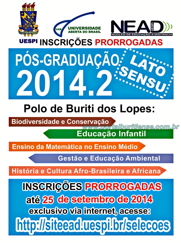 O Núcleo de Educação a Distância (NEAD), da Universidade Estadual do Piauí (UESPI) já recebeu um número significativo de candidatos tanto para o Vestibular, a seleção de tutores e os cursos de especialização, que tiveram início no último dia 05 de setembro e teve sua data prorrogada hoje para o dia 25 de setembro. “Devido a grande procura no período de inscrições vimos a necessidade de prolongar esse período. Ainda dá tempo para você fazer sua inscrição. A Educação é o que pode mudar toda uma vida e o NEAD/UESPI leva essa educação para você”, afirmou a Diretora geral.