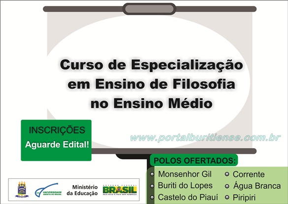 Em breve o polo UAB de Buriti dos Lopes estará ofertando, pela Universidade Federal do Piauí – UFPI, um novo curso. Trata-se de uma Pós-graduação em Ensino de Filosofia para o Ensino Médio. Aguarde maiores informações.