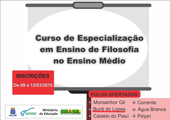 O Diretor do Centro de Educação Aberta e a Distância da Universidae Federal do Piauí –(CEAD/UFPI),  e Coordenador  UAB  na  UFPI,  com  anuência  da  CAPES/UAB,  e no  uso  de suas  atribuições  legais,  torna  público  aos  interessados  que estarão  abertas  as  inscrições  do Proceso  Seletivo  par  o prenchimento  de  180 (cento  e oitenta)  vags  do  Curso  de Especialização  em  Ensino  de  Filosofia  no  Ensino  Médio,  na  modalidade  à distância,  no âmbito da Universidade Federal do Piauí.