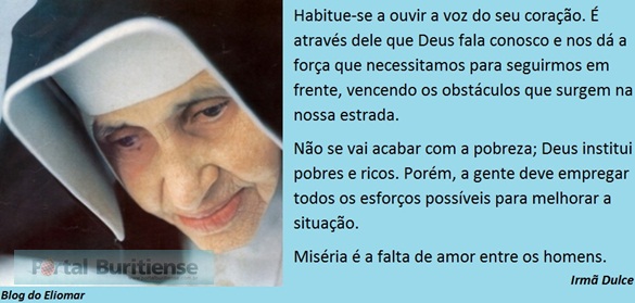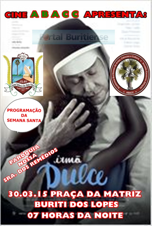 O CINE ABACC da Academia Buritiense de Artes, Ciências e Cultura – ABACC – Arnaldo Escórcio Athayde, de nossa Cidade, apresenta o FILME IRMÃ DULCE – O ANJO BOM DA BAHIA, dentro da Programação da SEMANA SANTA da Paróquia de Nossa Senhora dos Remédios, na segunda-feira Santa, dia 30 de março de 2015, às 07 horas da noite (19h00), na Praça da Matriz.