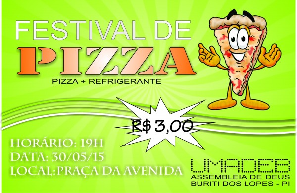 A UMADEB (União da Mocidade da Assembleia de Deus de Buriti) promove festival de pizza neste sábado ( 30/05) a partir das 19h na Praça da Avenida.