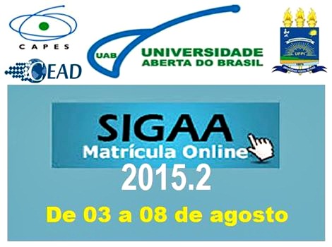 A Universidade Federal do Piauí (UFPI), através do Centro de Educação Aberta e a Distância (CEAD), comunica que a matrículaonline para o período 2015.2 será do dia 03 ao dia 08 de agosto. O período letivo terá início dia 14 de agosto.