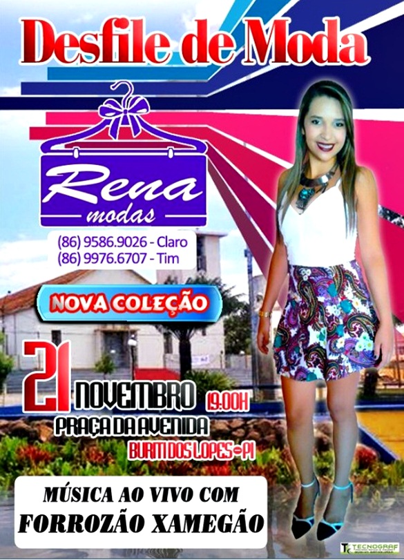 Vem aí o 1º Desfile de Modas da “Rena Modas”. O evento será realizado no dia 21 de novembro na Praça Raimundo Soares (Avenida) e será animado pelo Forrozão Xamegão. Durante o evento você poderá adquirir peças com 15% de desconto na compra à vista, serão aceitos cartões de crédito das bandeira Visa e Mastercard. Você poderá conferir os últimos laçamentos da moda feminina, adulto e infantil (Tal Mãe, Tal Filha), além de produtos eróticos. Não perca!!!