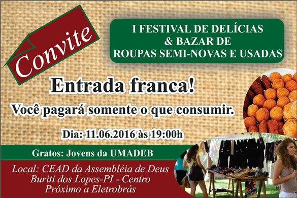 A UMADEB (União de Mocidade da Assembléia de Deus em Buriti dos Lopes) em nome de sua presidente Berenice Diniz Amaral, tem a honra convidar a toda população de Buriti dos Lopes e regiões circunvizinhas para um grande evento no dia 11.06.2016 ás 19:00 horas, o evento acontecera no CEAD da Assembléia de DEUS de Burti dos Lopes, na rua Antônio Paulo de Sousa próximo a Eletrobrás.