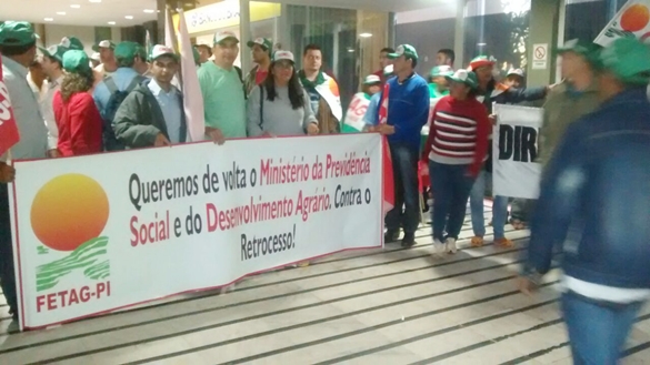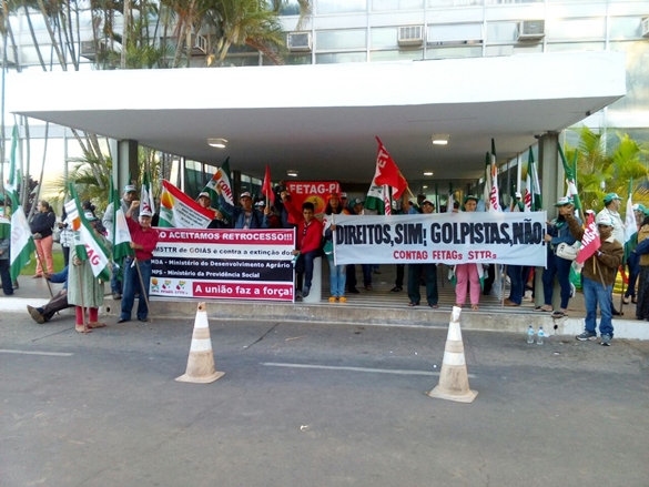 “O Dia 16 de Junho entrará para a história da CONTAG, das Federações e Sindicatos como uma das maiores mobilizações já realizadas pelo MSTTR”. Foi assim que o presidente da CONTAG, Alberto Ercílio Broch, encerrou o dia de Mobilização Nacional em frente ao Ministério do Desenvolvimento Agrário (MDA), na Esplanada dos Ministérios, em Brasília, cuja pauta era em defesa da DEMOCRACIA, contra a reforma da Previdência Social, contra a extinção dos Ministérios do Desenvolvimento Agrário (MDA) e da Previdência Social, e pela manutenção do Programa Nacional de Habitação Rural (PNHR).Cerca de 10 mil trabalhadores e trabalhadoras rurais dos estados de Minas Gerais, Espírito Santo, Goiás, Piauí, Bahia, São Paulo, e do Distrito Federal enviaram delegações para a mobilização na capital federal. Às 4 horas da madrugada os trabalhadores(as) resolveram ocupar os Ministérios do Desenvolvimento Agrário (MDA) e da Previdência, como forma de cobrar a retomada destes Ministérios que sempre trabalharam políticas fundamentais para a agricultura familiar e para os trabalhadores e trabalhadoras do campo e da cidade.A ocupação terminou por volta das 16 horas, depois que uma comissão de dirigentes da CONTAG e das Federações foi recebida por uma equipe da Casa Civil, onde apresentou os pleitosOs trabalhadores e trabalhadoras rurais retornaram aos seus estados motivados(as) com a sua capacidade de mobilização, e fizeram o compromisso de permanecerem vigilantes contra qualquer forma de retrocesso de direitos que prejudique todas e todos que vivem no meio rural brasileiro. Afirmaram através de frases de ordem que vão permanecer com suas bandeiras de luta hasteadas até que consigam reverter a decisão de extinguir os Ministérios e de manter assegurados(as) os direitos da classe trabalhadora.Essa ação integrou a estratégia de realização de uma grande Mobilização Nacional, que reuniu em todo o País cerca de 130 mil trabalhadores e trabalhadoras rurais. Aconteceram, simultaneamente, ocupações em agências, gerências e superintendências do INSS, entre outras ações.