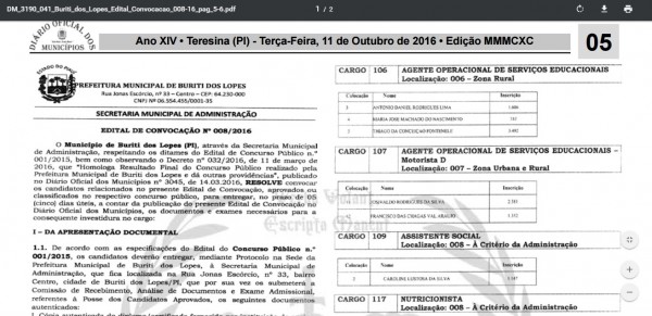 A Prefeitura Municipal de Buriti dos Lopes realizou, nesta terça-feira, 11 de outubro a 8ª convocação do Concurso público nº 001/2015, publicado no diário oficial desta data. Podendo ser acessado em: http://www.diarioficialdosmunicipios.org/intranet/_lib/file/doc/pdfs/3190%20/DM_3190_041_Buriti_dos_Lopes_Edital_Convocacao_008-16_pag_5-6.pdf