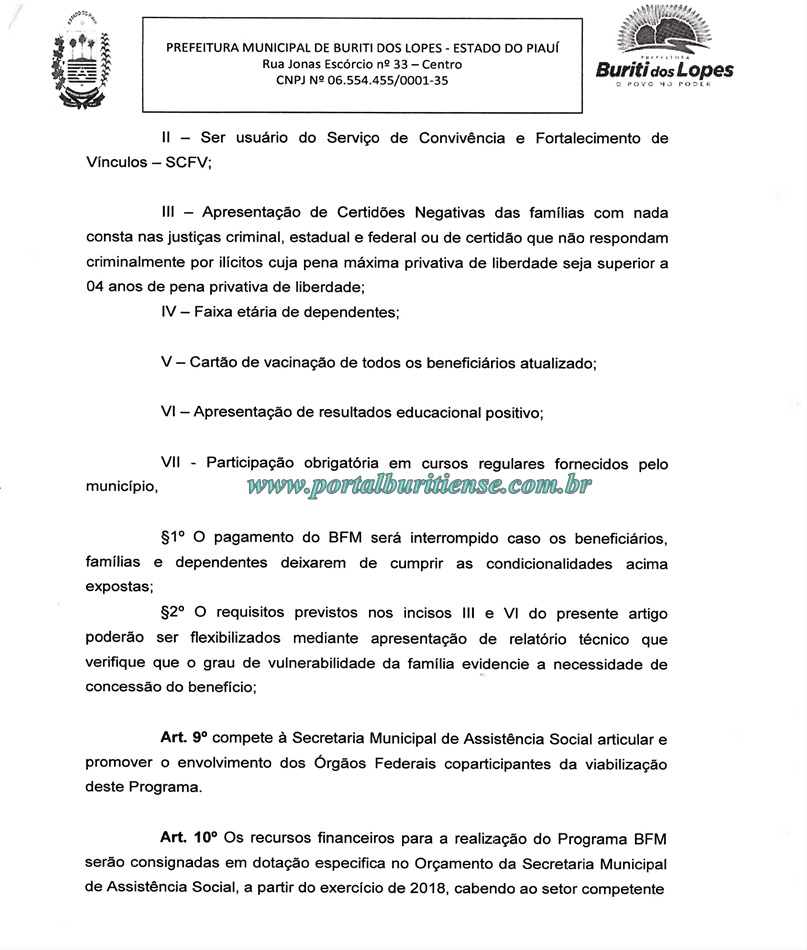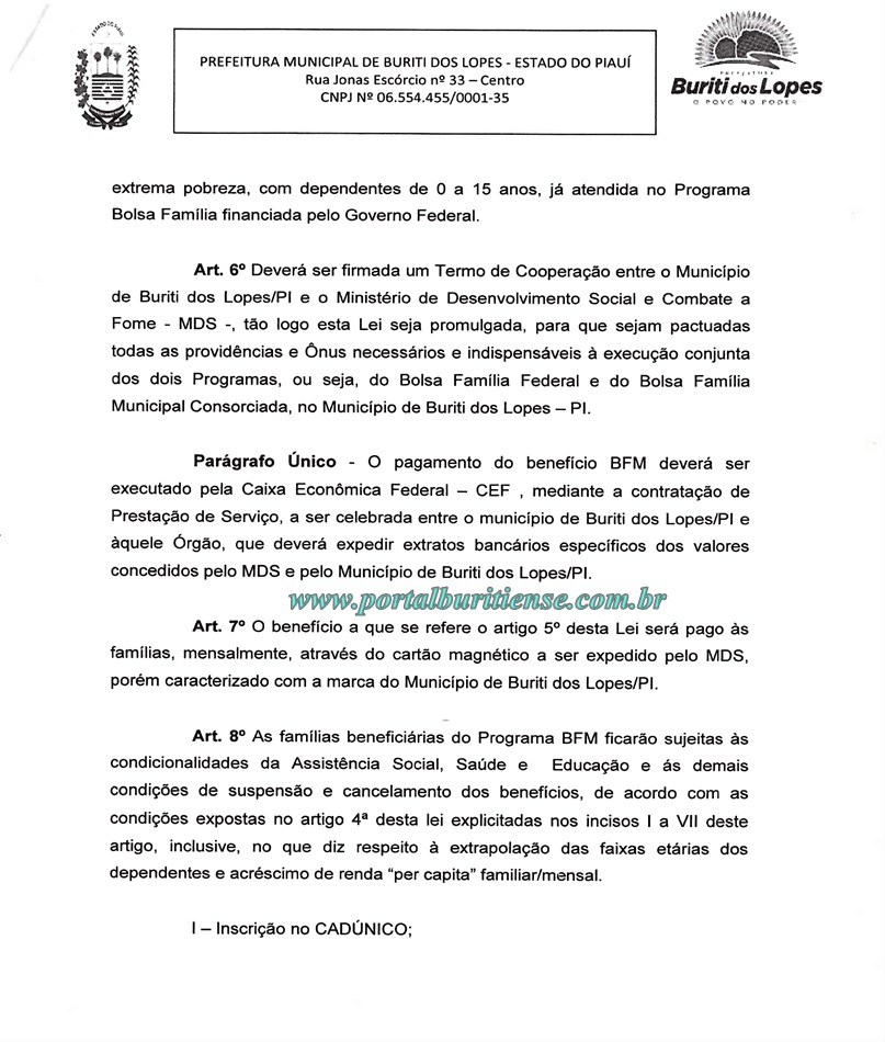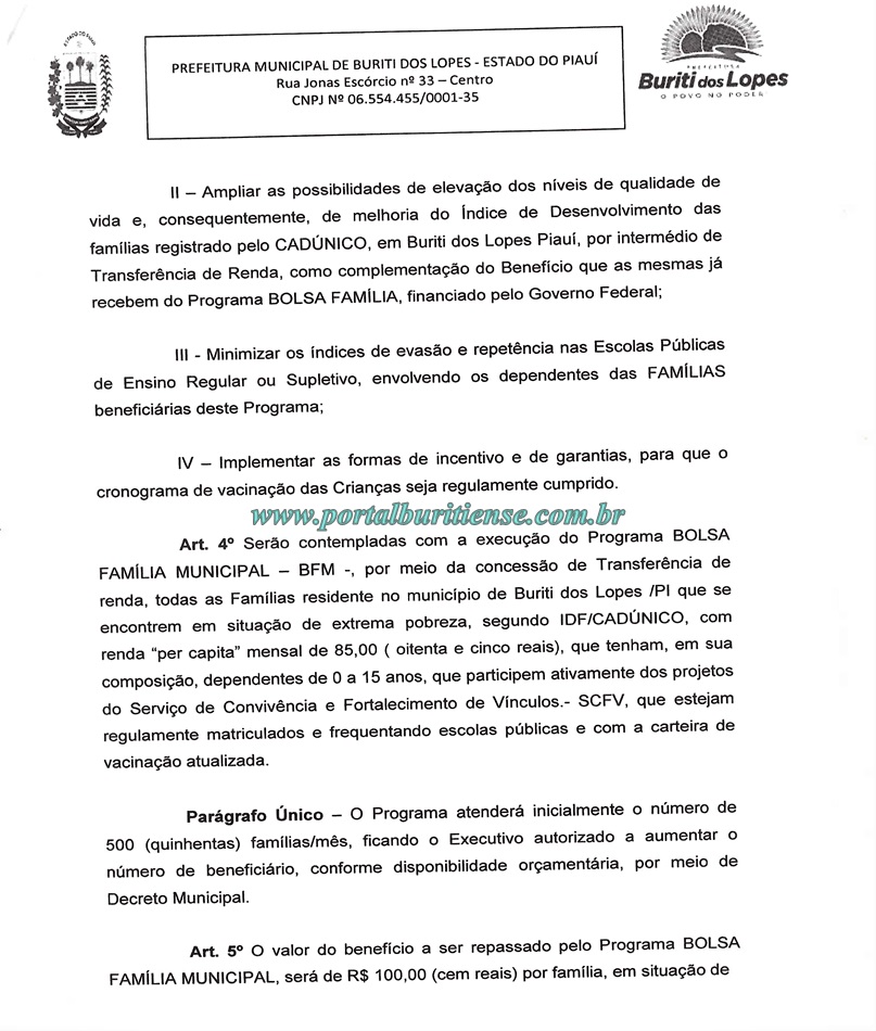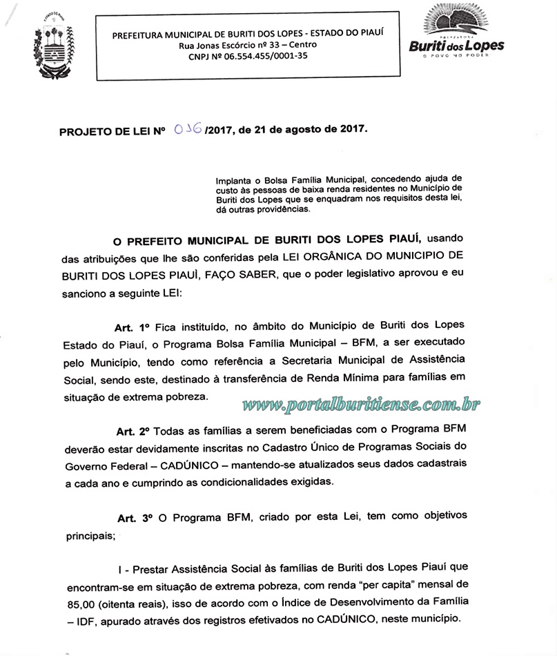 A Câmara Municipal de Vereadores de Buriti dos Lopes recebeu na noite desta quarta (30), o Projeto de Lei N° 016/2017 de autoria do Executivo Municipal que prevê a implantação do Programa Bolsa Família Municipal (BFM), o mesmo visa conceder ajuda de custa às pessoas de baixa renda que residem no município e se enquadrarem nos requisitos da referida Lei.