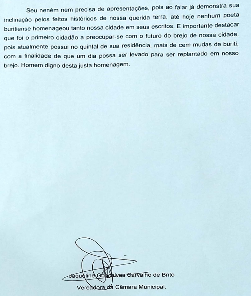 Em sua justificativa pela concessão da horaria ao nosso poeta maior, a Vereadora Jaqueline Brito elencou as inúmeras qualidades do homenageado, disse que o Título de Cidadania Buritiense é uma maneira da Câmara Municipal de Buriti dos Lopes e de toda sociedade buritiense de devolver ao Senhor Neném Calixto todo carinho e o mesmo tem demonstrado pela terra que o acolheu e escolheu para viver.