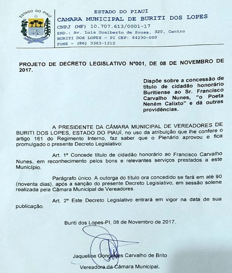 Reconhecendo a importância e o valor do mais importante poeta da atualidade buritiense, a Presidenta da Câmara Municipal de Vereadores de Buriti dos Lopes, Vereadora Jaqueline Brito, apresentou na última sessão parlamentar daquela casa um Projeto de Decreto Legislativo que dispõe sobre a concessão de Título de Cidadania Buritiense ao Senhor Francisco Carvalho Nunes, popularmente conhecido como “Poeta Nenêm Calixto”. O título é concedido aos cidadãos que não são naturais do município e tenham relevantes serviços prestados à sociedade buritiense.