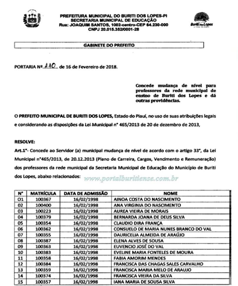 O Prefeito de Buriti dos Lopes, Junior Percy, e o Secretário de Educação, Fernando Liberato, concedem mudança de nível para os servidores municipais de acordo com a Lei Municipal Número 465/2013 de 20 de dezembro de 2013. Obedecendo ao Plano de Carreira, Cargos, Vencimentos e Remuneração e os direitos dos servidores firmando o compromisso da gestão com a valorização dos professores e os demais profissionais da educação.