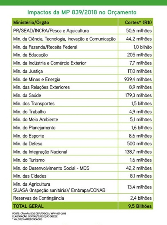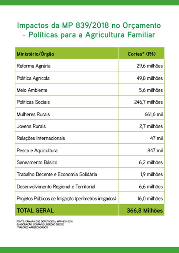 Entre a aprovação da LOA 2018 e o valor atual disponível para cada ação, o governo já havia cortado R$ 78,3 milhões da obtenção de terras e organização da estrutura fundiária; R$ 10,9 milhões das obras e equipamentos para oferta de água; R$ 9,1 milhões do controle e fiscalização ambiental; R$ 29,8 milhões da promoção da igualdade e enfrentamento à violência contra a mulher; R$ 1,8 milhão do Pronera; R$ 42,8 milhões do saneamento rural e R$ 210,0 milhões do PAA. Isso já representou um corte de R$ 382,9 milhões mesmo antes da edição da MP 839/2018.