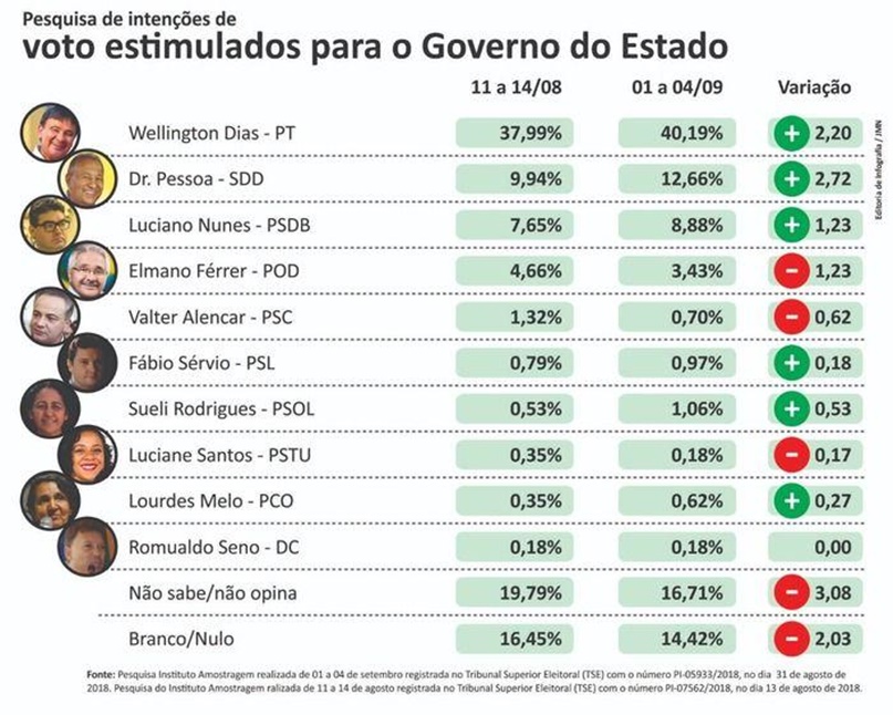 Os eleitores que ainda não escolheram os candidatos são 16,71% e os que querem votar em branco ou nulo representam 14,42%. A pesquisa foi realizada entre os dias 1º a 4 de setembro, com 1.137 eleitores em 47 municípios de todas as microrregiões do Piauí.