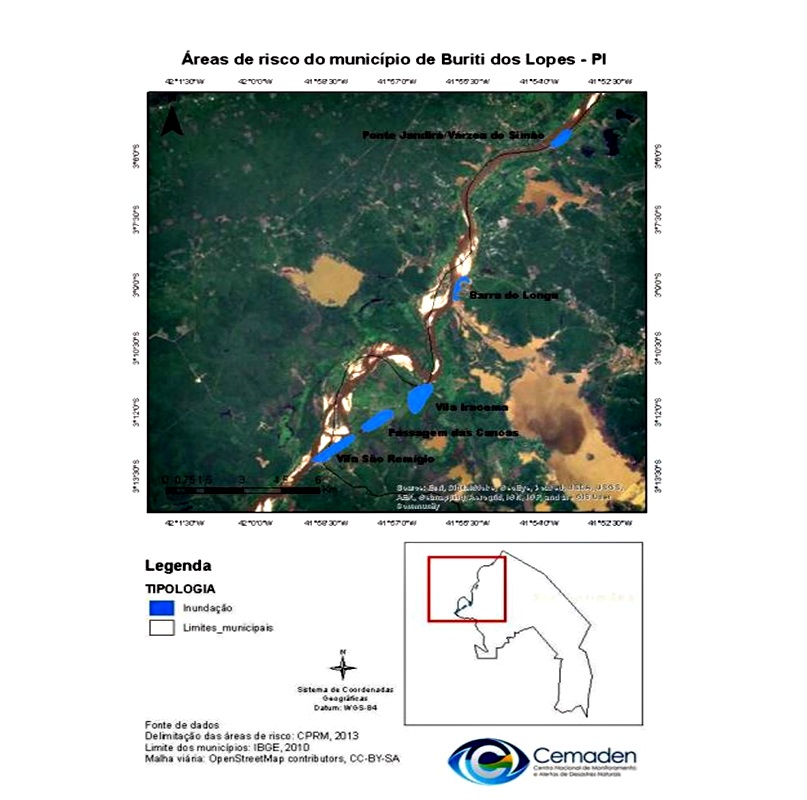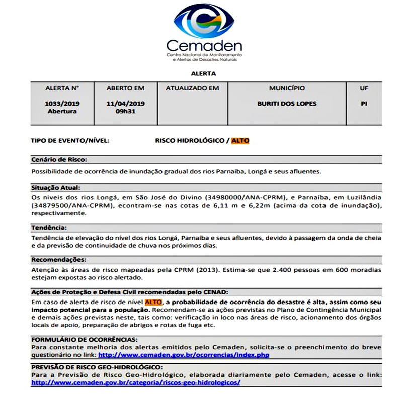A Defesa Civil do Estado emitiu hoje um alerta de inundação das localidades ribeirinhas do município de Buriti dos Lopes, segundo o relatório do Centro Nacional de Monitoramento e Alertas de Desastres Naturais – Cemaden o risco de alagamento é considerável e está no patamar de ALTO pois o nível dos rios Longá, em São José do Divino, e Parnaíba, em Luzilândia, encontram-se nas cotas de 6,11 m e 6,22 m (acima da cota de inundação) respectivamente. Ainda segundo descrito no relatório a tendencia é que aja elevação do nível dos mesmos rios e seus afluentes devido a passagem da onda de cheia e da previsão de continuidade de chuva nos próximos dias.