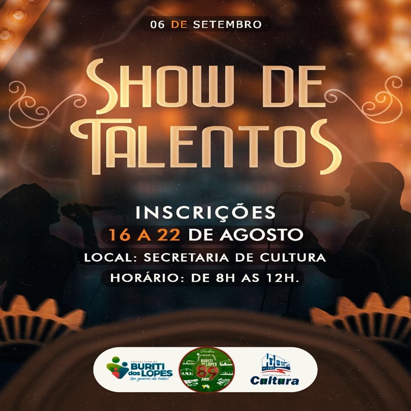A Prefeitura, através da Secretaria Municipal de Cultura, INFORMA que estão abertas a partir desta terça-feira (16/08) as inscrições para o Show de Talentos. O evento integra a programação do aniversário de 89 anos de Buriti dos Lopes.