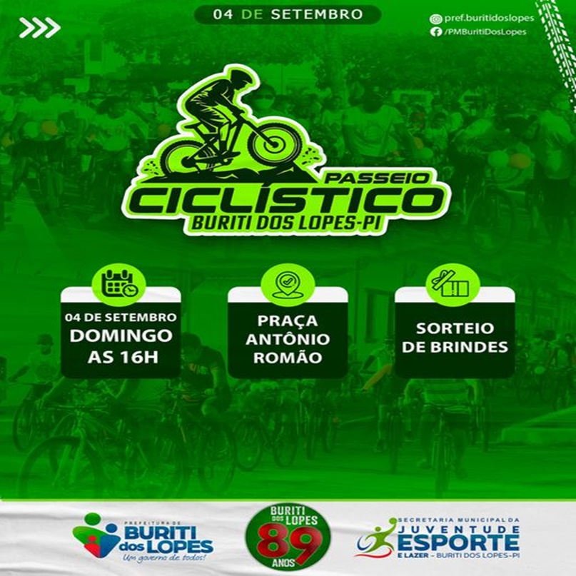 A Prefeitura de Buriti dos Lopes realiza no dia 04 de setembro um Passeio Ciclístico pelas principais ruas da cidade, marcando também as comemorações do aniversário de 89 anos do Município.