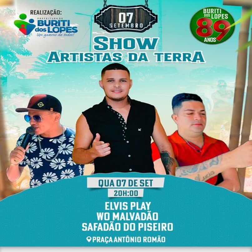 A Prefeitura de Buriti dos Lopes celebra o Dia 07 de Setembro com um show na Praça Antônio Romão, a partir das 20h com os ARTISTAS DA TERRA, marcando também as comemorações do aniversário de 89 anos da cidade.