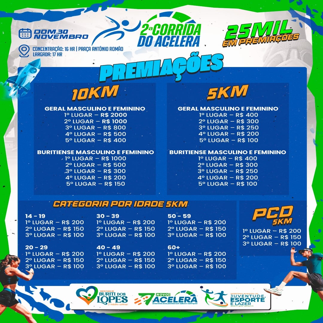 Prefeitura Municipal de Buriti dos Lopes, através da Secretaria Municipal de Juventude, Esporte e Lazer, divulga os valores referentes às categorias da 2ª Corrida do Acelera Buriti. Confira o regulamento da competição: Regulamento – 2º Corrida do Acelera.