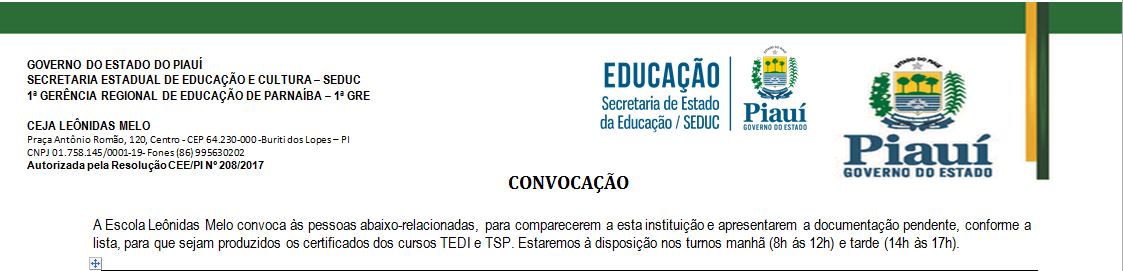 Unidade Escolar Leônidas Melo Divulga Nova Convocação